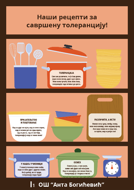 Наши најмлађи ученици, ученици 1/2 су са својом учитељицом Јасмином Мишић реализовали радионицу „Слични, а различити“ на свој начин. Иако још увек нису научили сва слова наше азбуке, то их није спречило да покажу све сличности које их спајају, као и све разлике које их допуњују. Још једни прваци, ученици 1/1 и њихова учитељица Србијанка Остојић су били јако вредни, те су на часовима грађанског васпитања и света око нас причом, цртањем, певањем и слушањем дали своје рецепте за савршену толеранцију. Све то је резултирало плакатом, који је направила родитељка Лидија Милошевић из истог одељења.