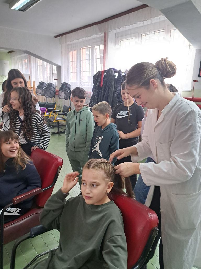 Дечија недеља је почела посетом ученика четвртог разреда ОШ “Анта Богићевић” који су се упознали са фризерском професијом кроз практично искуство, опробавање у улози фризера и дружењу са ученицима и наставницима средње школе. Неки су изашли из наше школе са новим фризурама, неки су новим фризурама улепшали наше ученике, али сви су се сјајно забавили и много тога новог научили. Хвала нашим дивним фризерима другог разреда који су данас своје знање преносили на основце и нашим професорицама практичне наставе Јелени Радишић и Надици Перић које су осмислиле и реализовале ово забавно дружење.